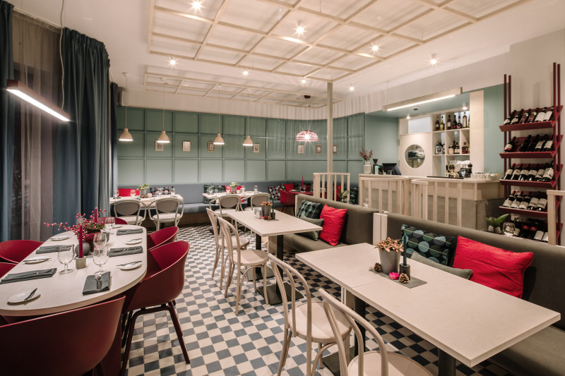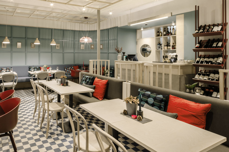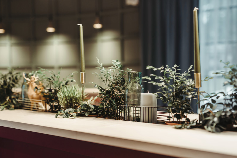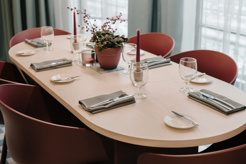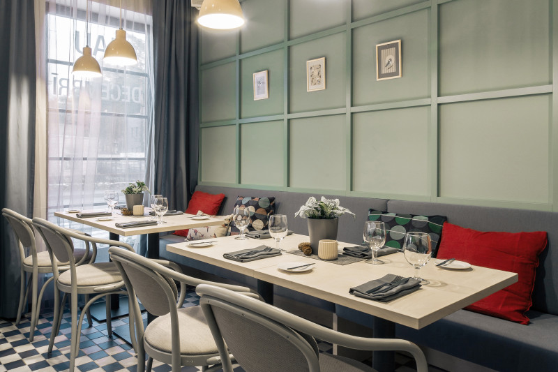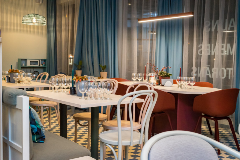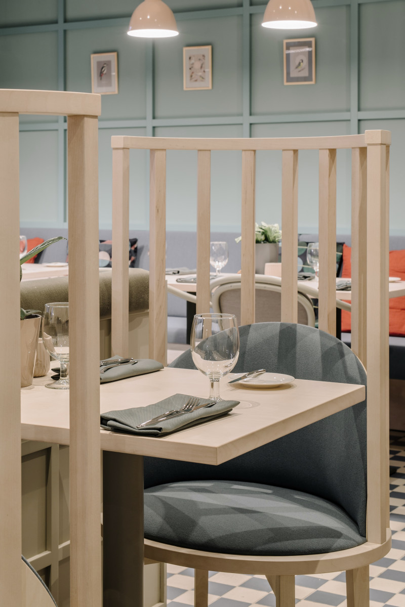 Hercogs Restaurant in Mezapark. Interaction of design and nature. Elegant birch texture in interaction with different plant accents. The nuanced tones and specially selected colour accents. A fresh place to stop, relax and have a pleasant meal.