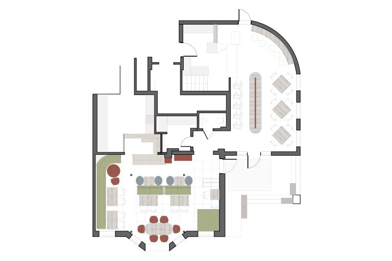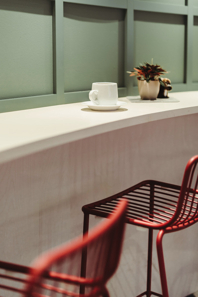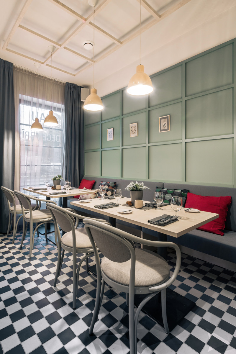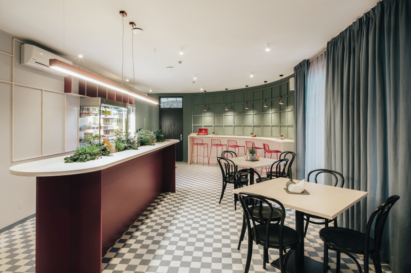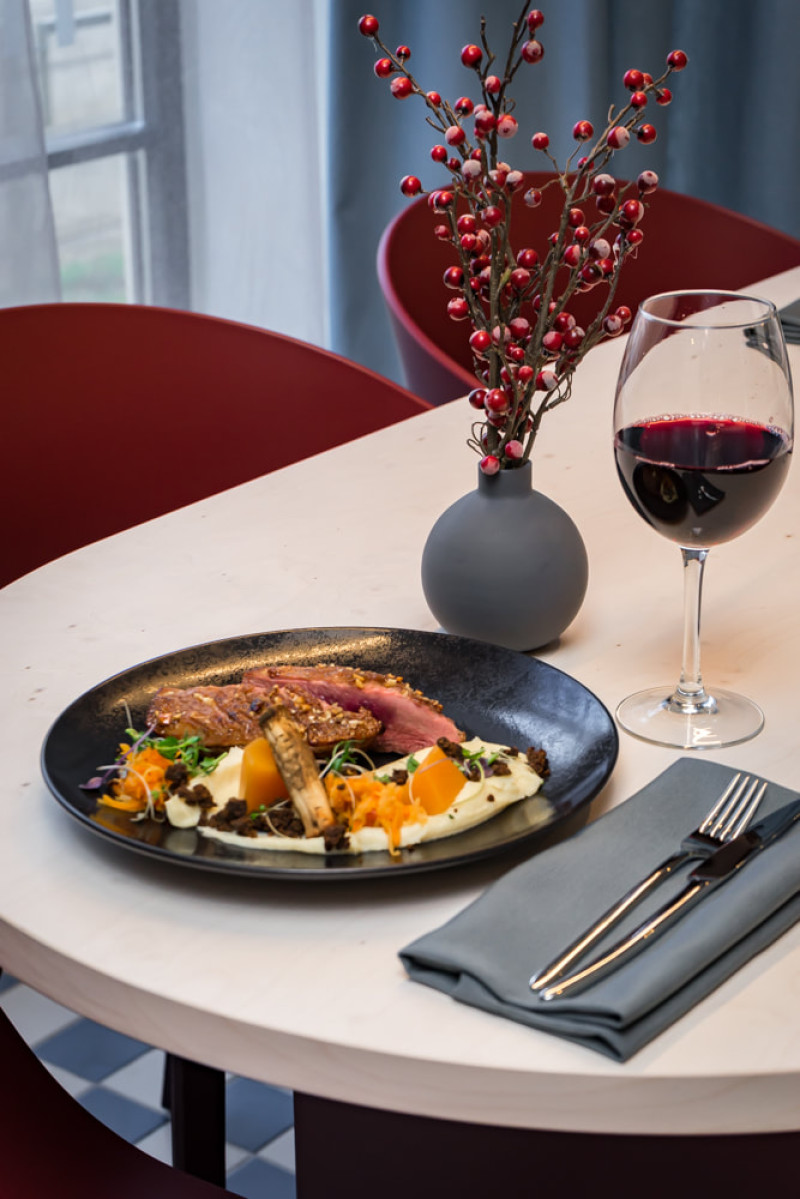 Hercogs Restaurant in Mezapark. Interaction of design and nature. Elegant birch texture in interaction with different plant accents. The nuanced tones and specially selected colour accents. A fresh place to stop, relax and have a pleasant meal.