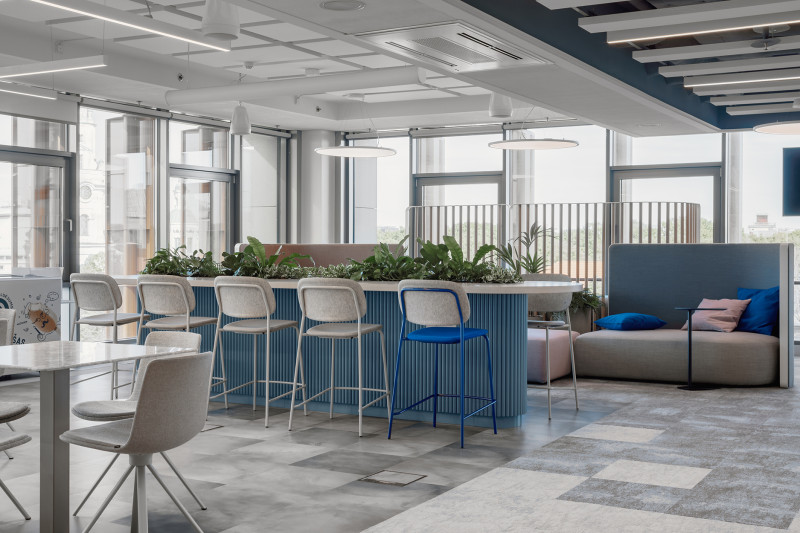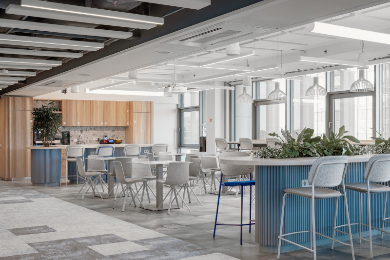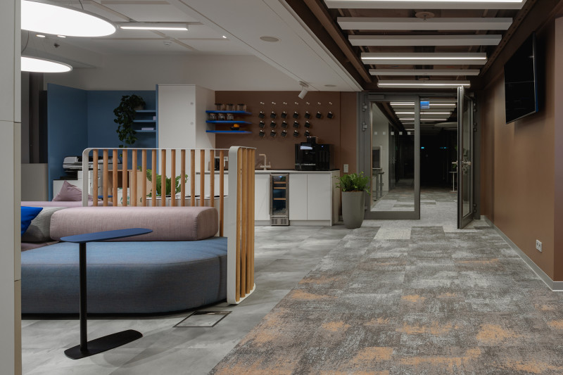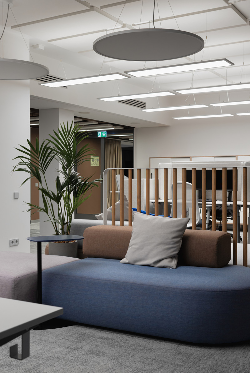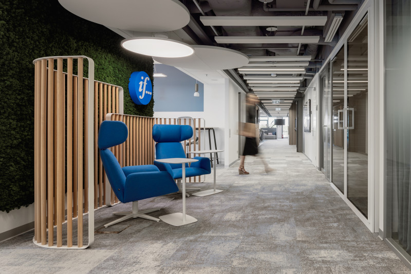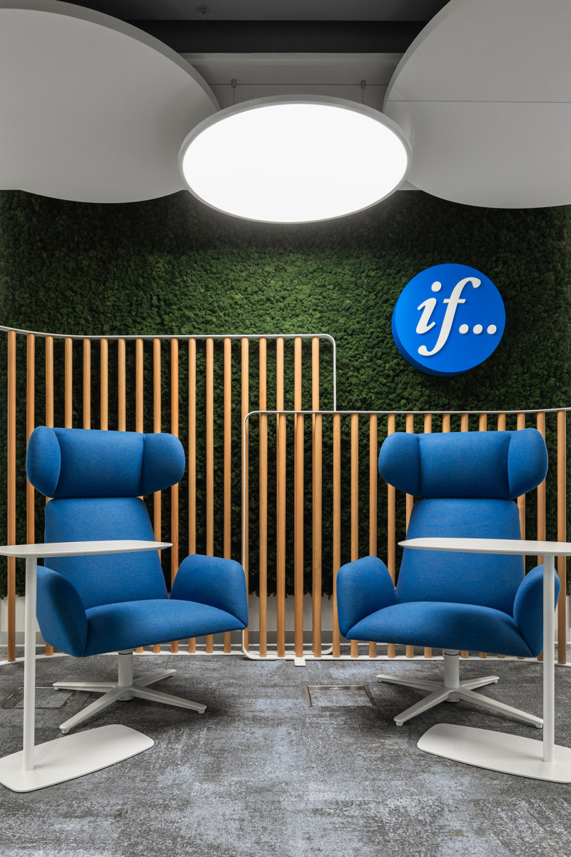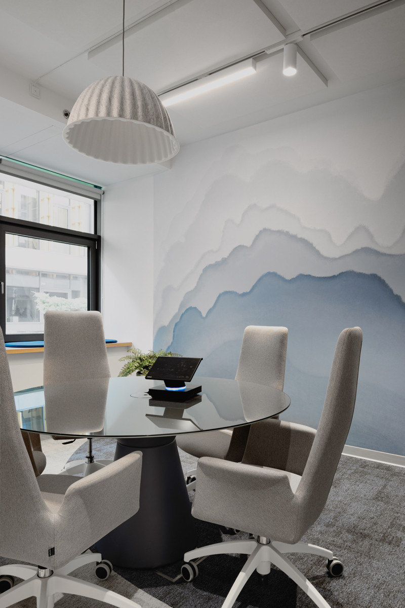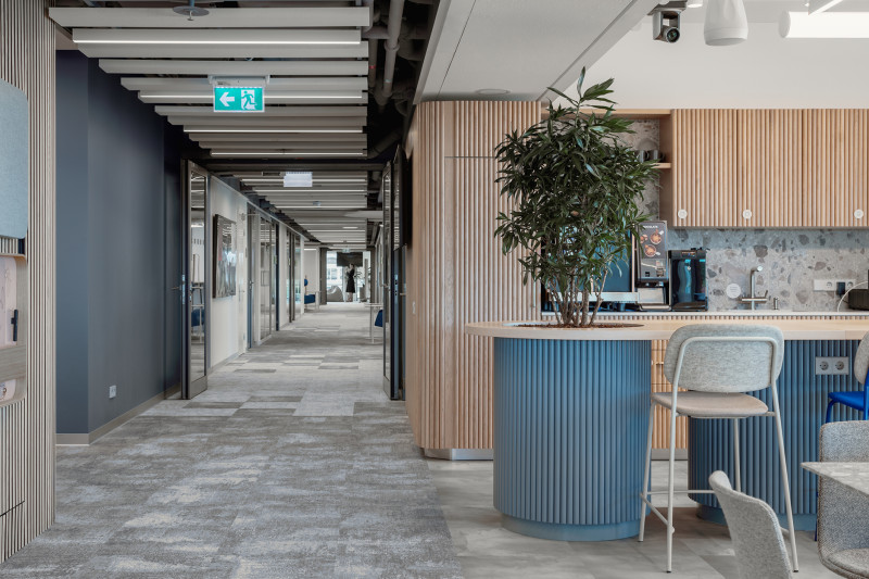 Interior design for IF Apdrošināšana in the Center of Riga, one of the largest insurance companies in Latvia. Each floor’s in different color tone changes the user experience while maintaining a unified identity. The space features a comfortable kitchen for daily use and gatherings, with a color palette of blue, gray, and natural wood, complemented by various textures and materials. High-quality materials, comfortable furniture design, coziness, and multifunctionality are the key elements for a successful and comfortable modern office environment.