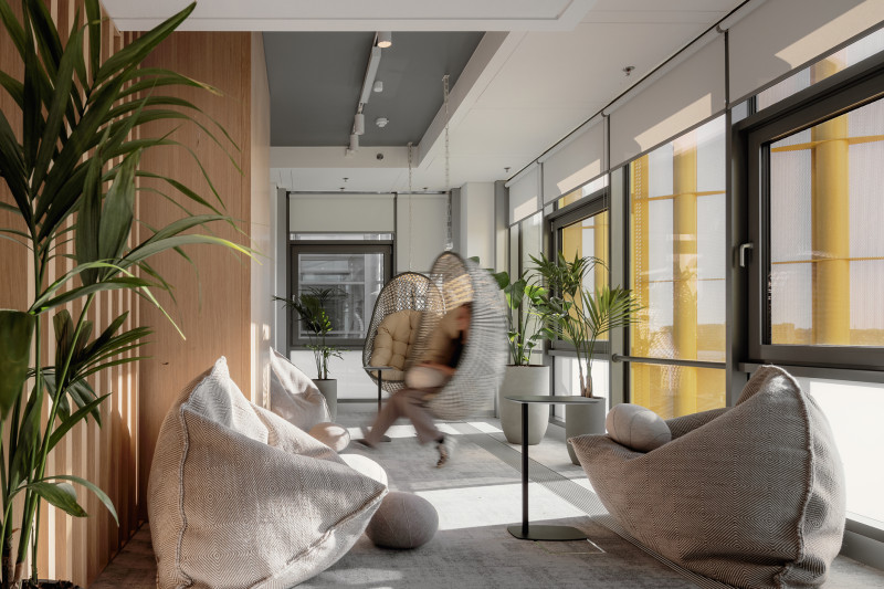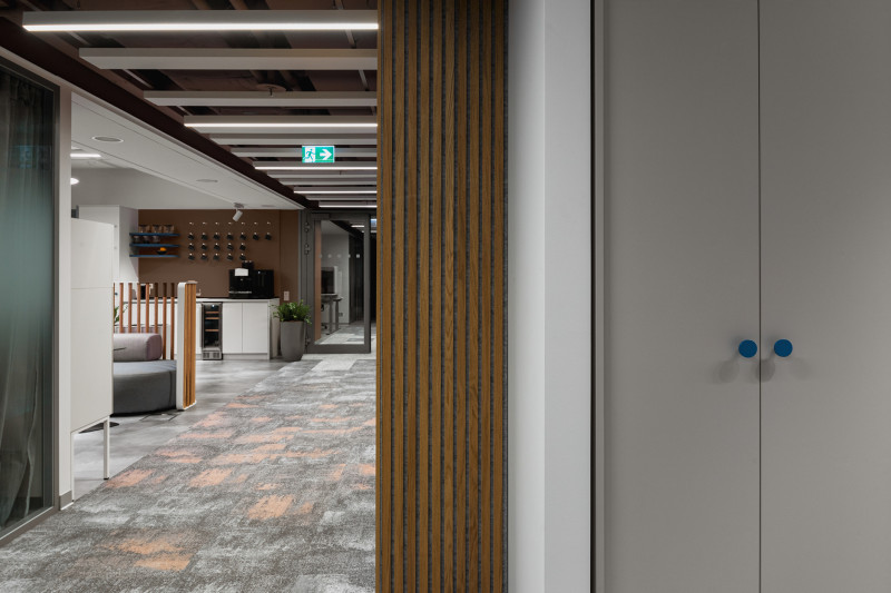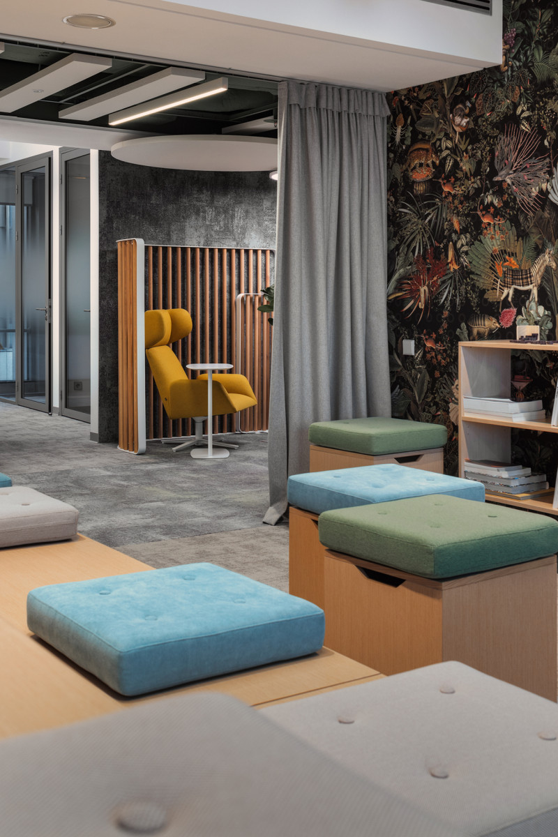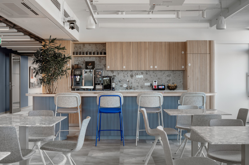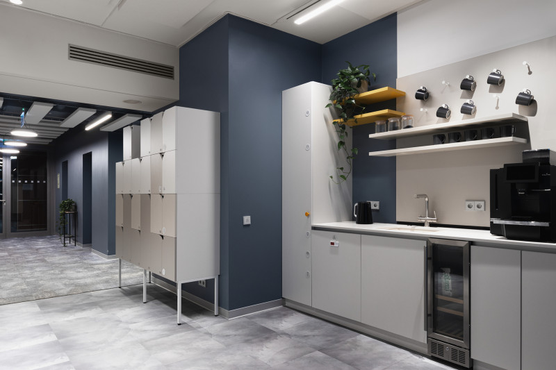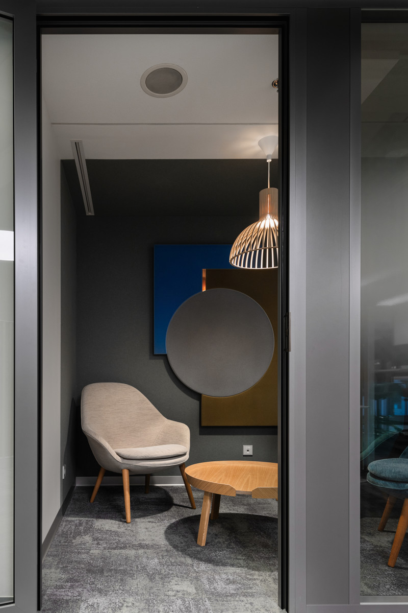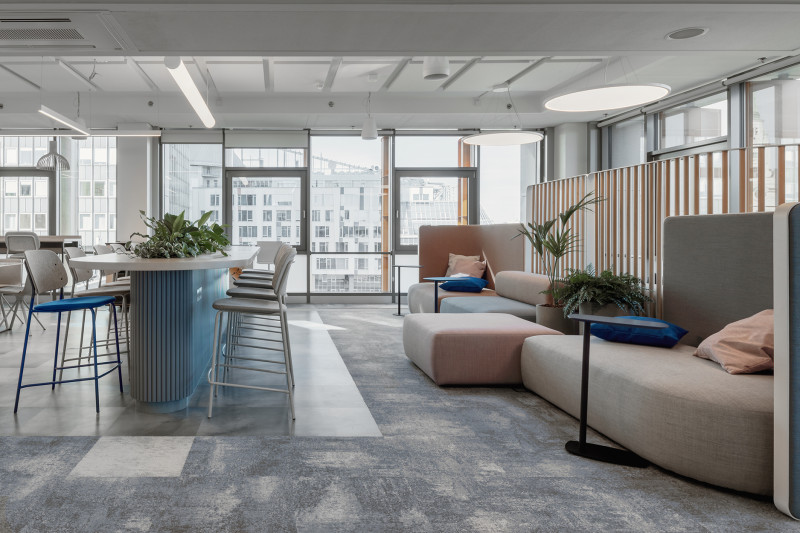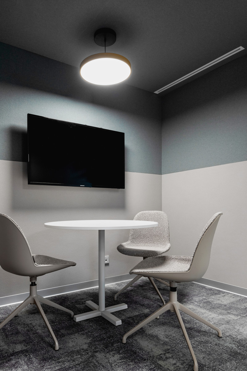 Interior design for IF Apdrošināšana in the Center of Riga, one of the largest insurance companies in Latvia. Each floor’s in different color tone changes the user experience while maintaining a unified identity. The space features a comfortable kitchen for daily use and gatherings, with a color palette of blue, gray, and natural wood, complemented by various textures and materials. High-quality materials, comfortable furniture design, coziness, and multifunctionality are the key elements for a successful and comfortable modern office environment.