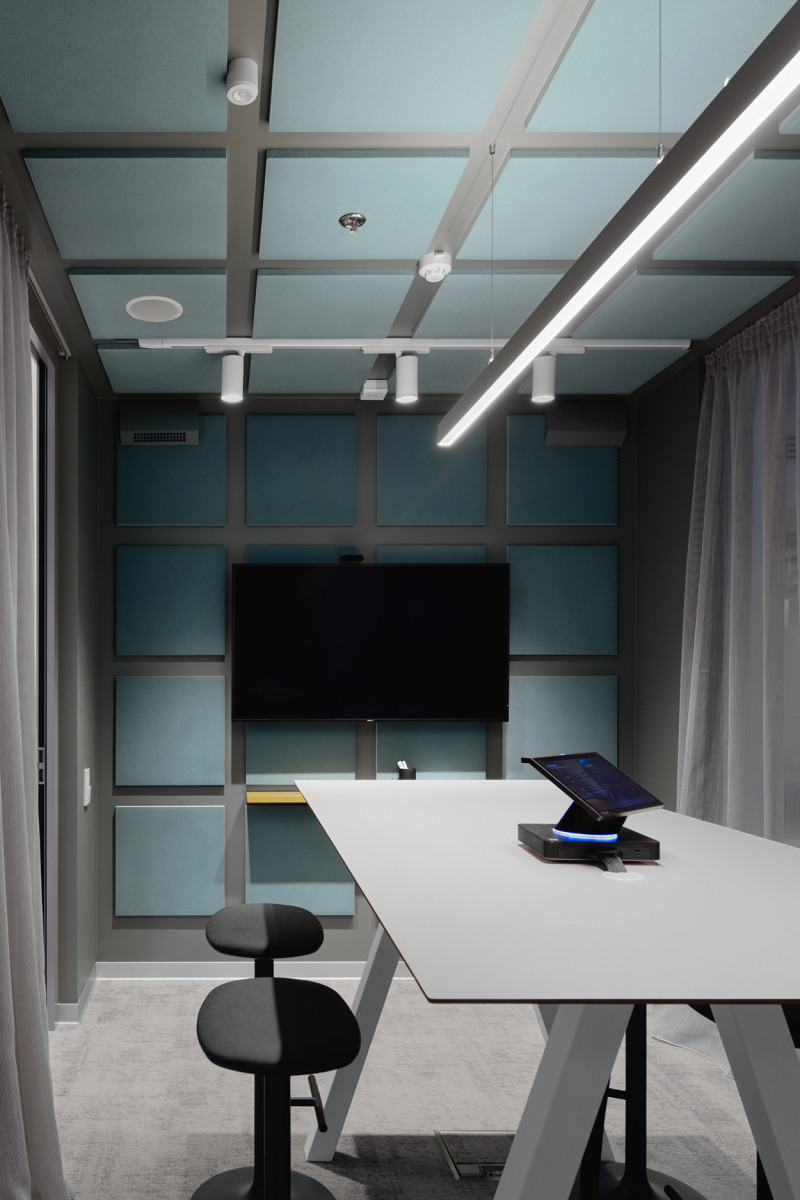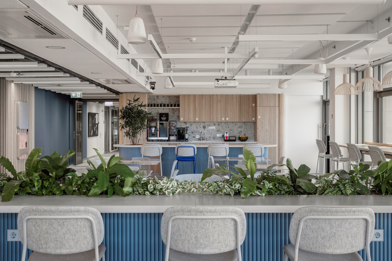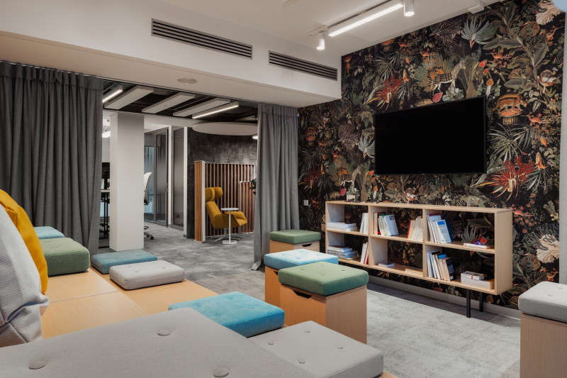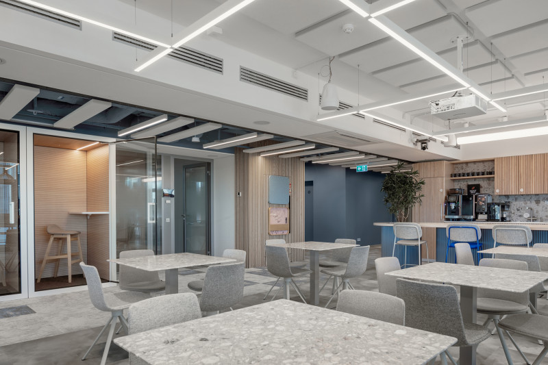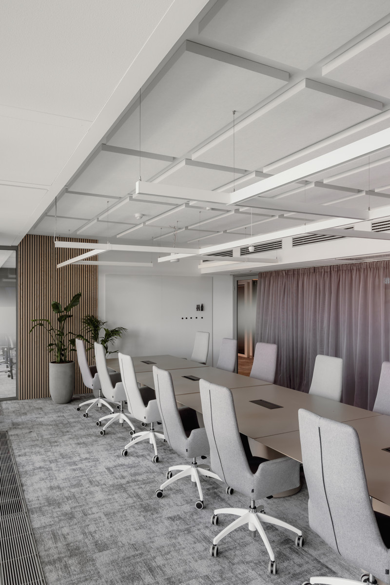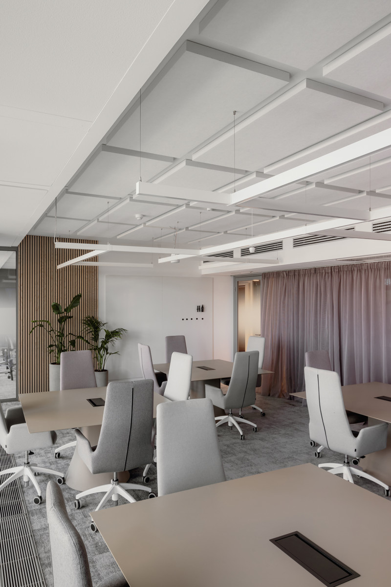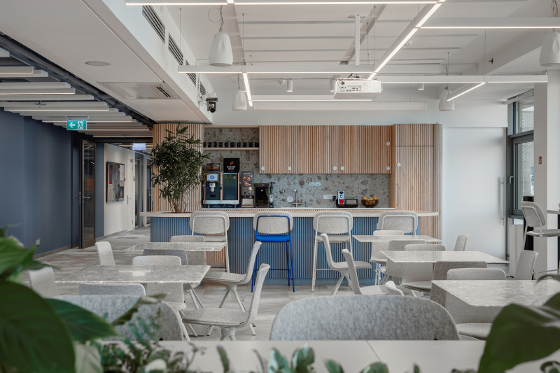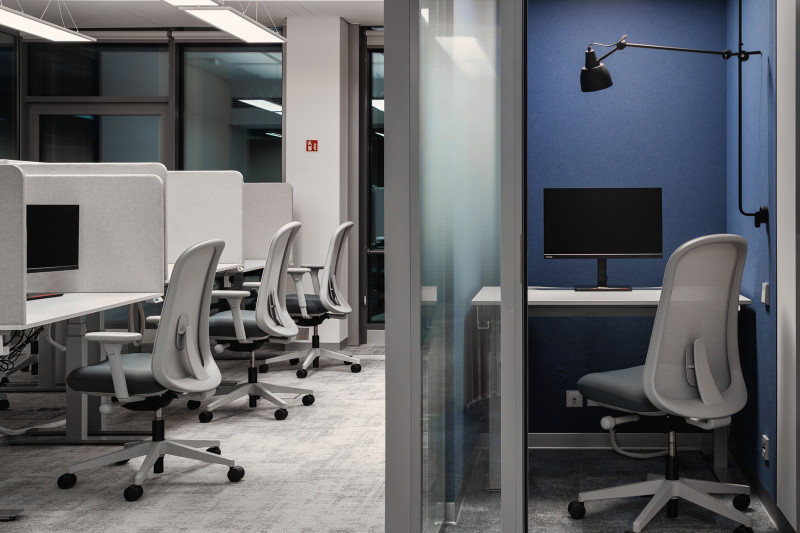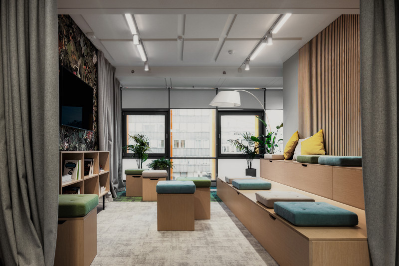 Interior design for IF Apdrošināšana in the Center of Riga, one of the largest insurance companies in Latvia. Each floor’s in different color tone changes the user experience while maintaining a unified identity. The space features a comfortable kitchen for daily use and gatherings, with a color palette of blue, gray, and natural wood, complemented by various textures and materials. High-quality materials, comfortable furniture design, coziness, and multifunctionality are the key elements for a successful and comfortable modern office environment.