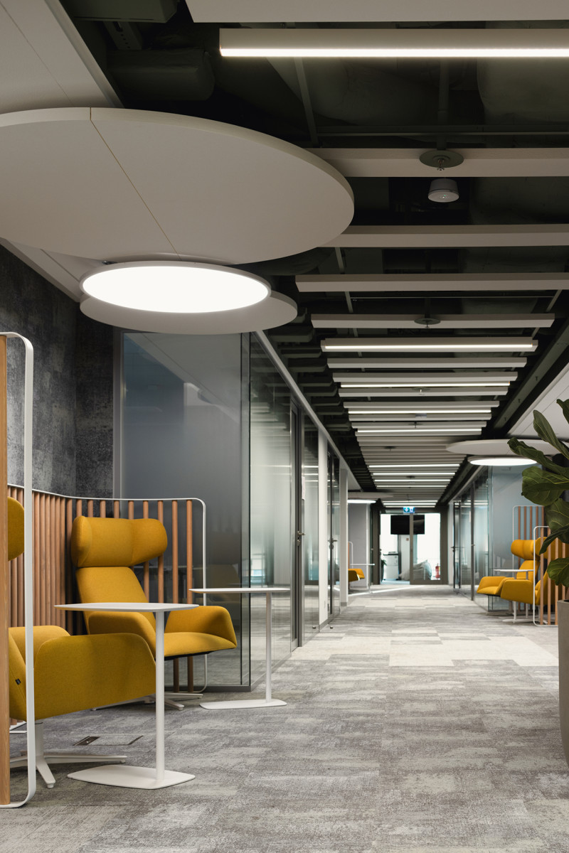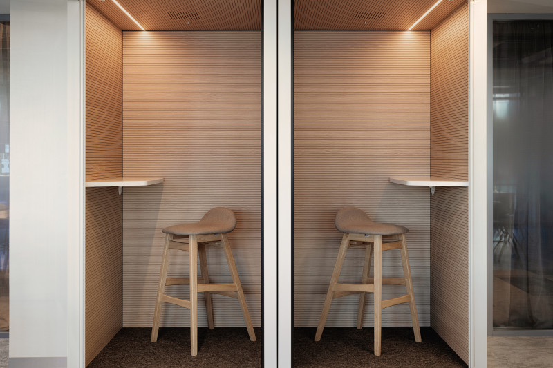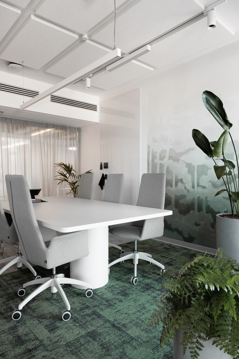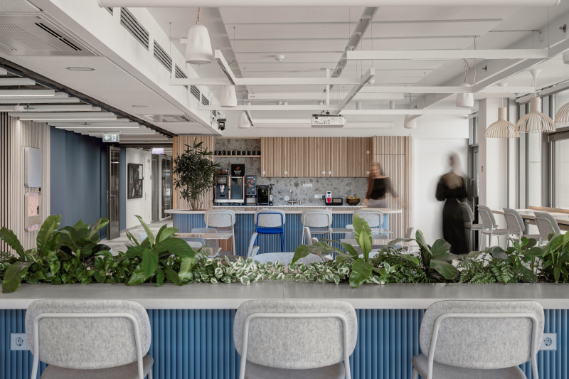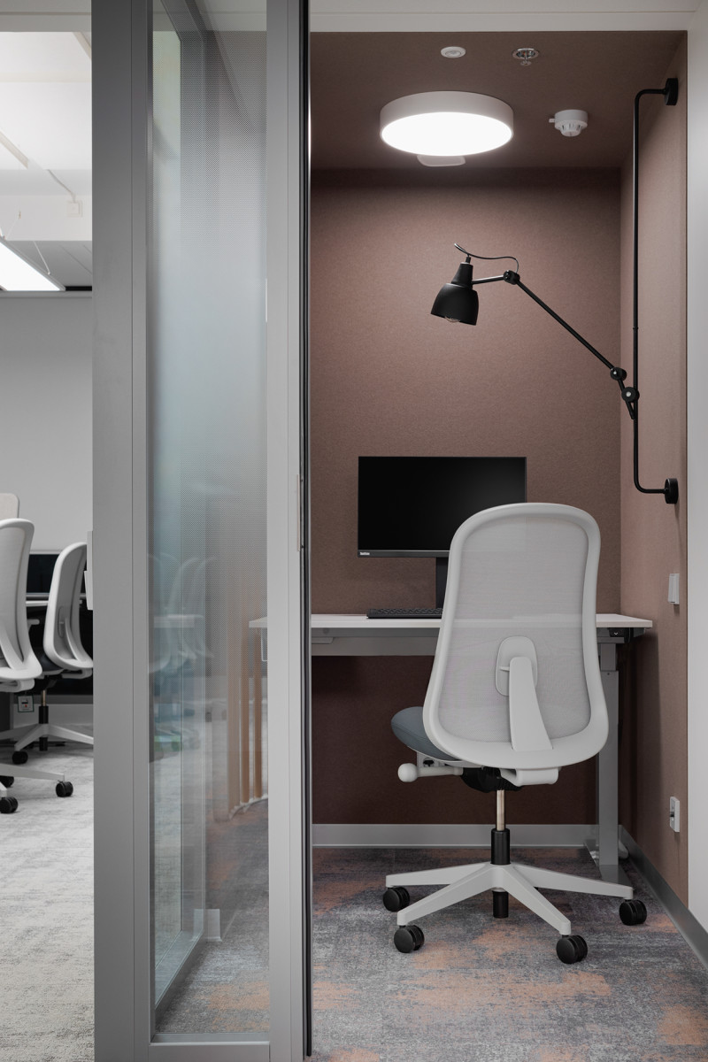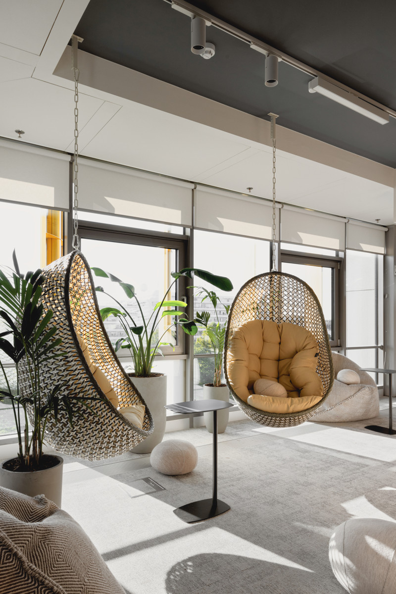 Interior design for IF Apdrošināšana in the Center of Riga, one of the largest insurance companies in Latvia. Each floor’s in different color tone changes the user experience while maintaining a unified identity. The space features a comfortable kitchen for daily use and gatherings, with a color palette of blue, gray, and natural wood, complemented by various textures and materials. High-quality materials, comfortable furniture design, coziness, and multifunctionality are the key elements for a successful and comfortable modern office environment.