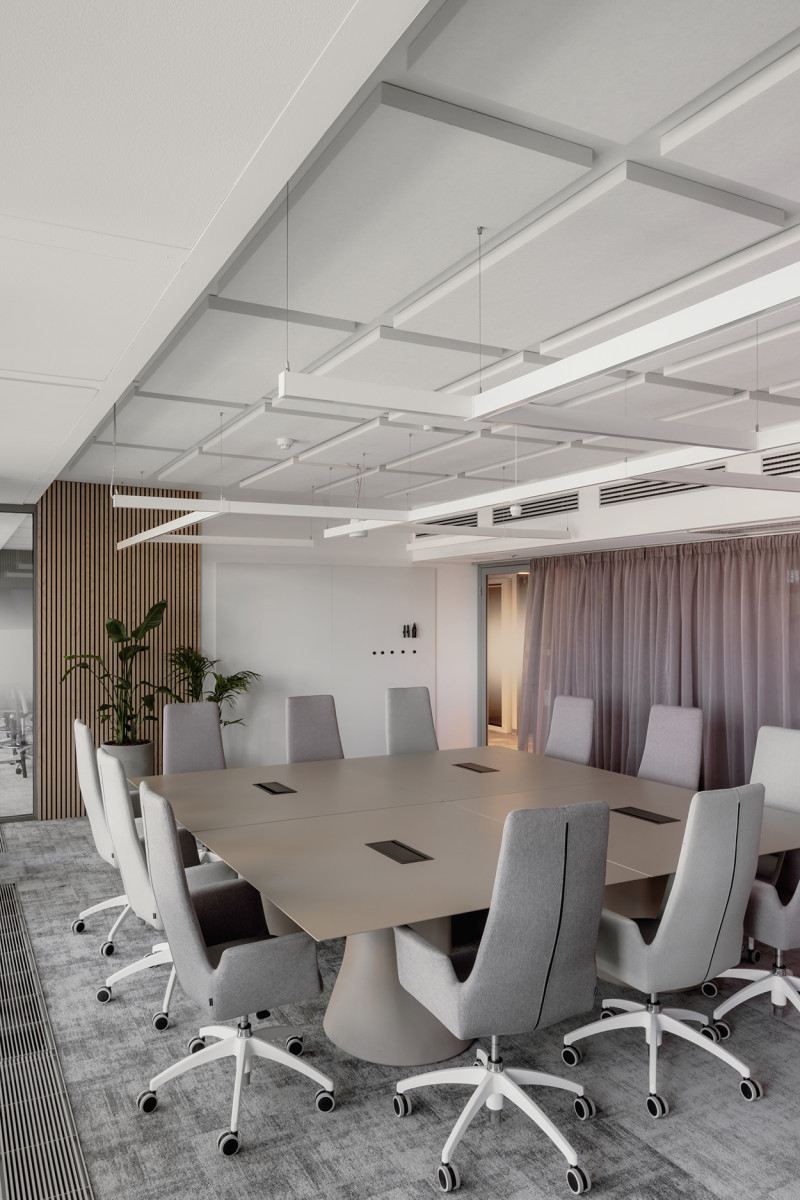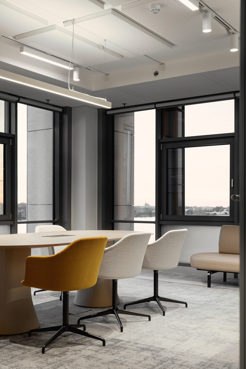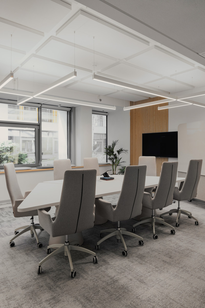 This meeting room features a flexible interior concept with a modular table design that can be easily moved and reconfigured. The lightweight table is equipped with lockable casters for effortless mobility, making it simple to adapt the furniture layout as needed. Integrated technology and durable, easy-to-clean surfaces enhance the functionality and practicality of the space.