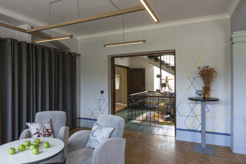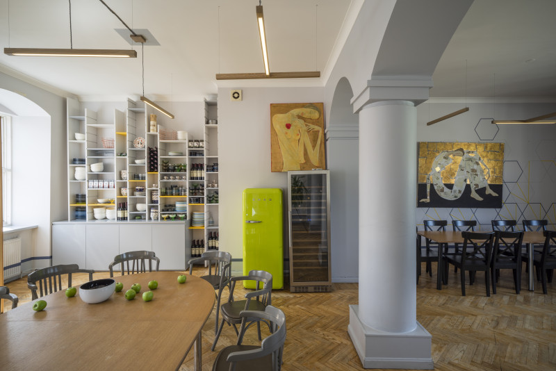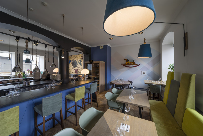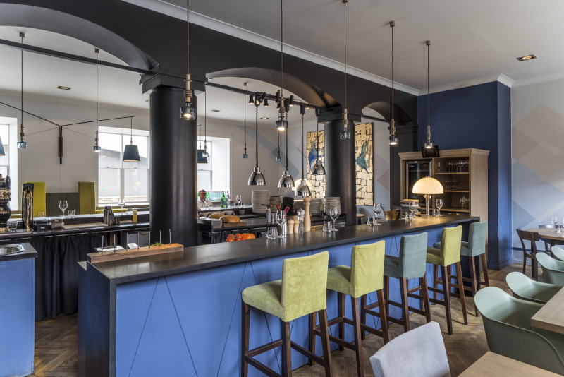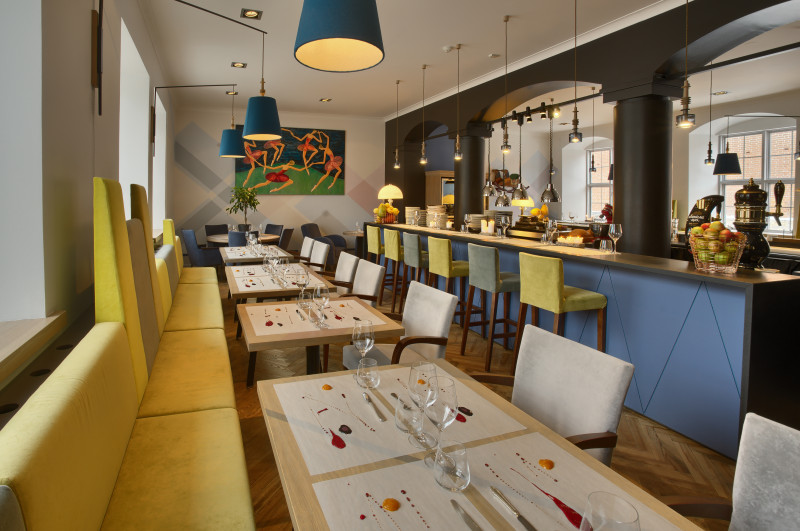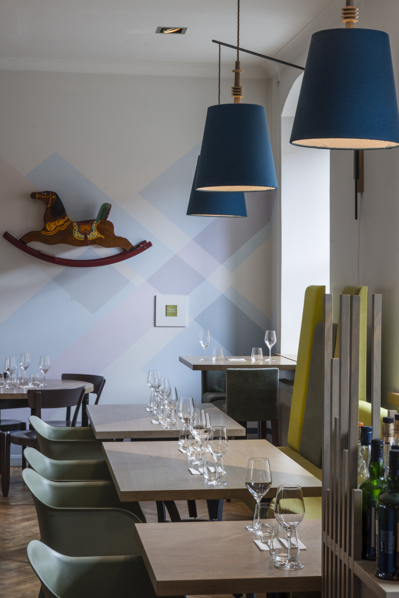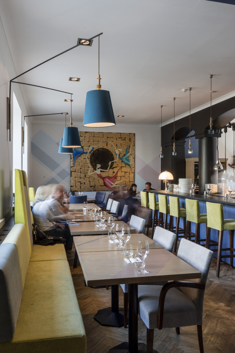 The Three Chefs restaurant has undergone a change on both floors, and the terrace has acquired a new form. The main task was to create a fresh and cosy interior while maintaining the special atmosphere that was there before. The main emphasis was placed on the walls and tables. On the 1st floor the main graphic design is a network of woven lines, but in the Iittala hall on the 2nd floor it is a fine, honeycomb pattern, which also highlights the refined dishes of this brand. The terrace structure is made of small metal bars, which gives it ease and transparency, while at the same time creating a sense of privacy for the restaurant’s guests. The configuration of the metal bars is inspired by the white, rectangular elements in the façade of Jacob’s Barracks.