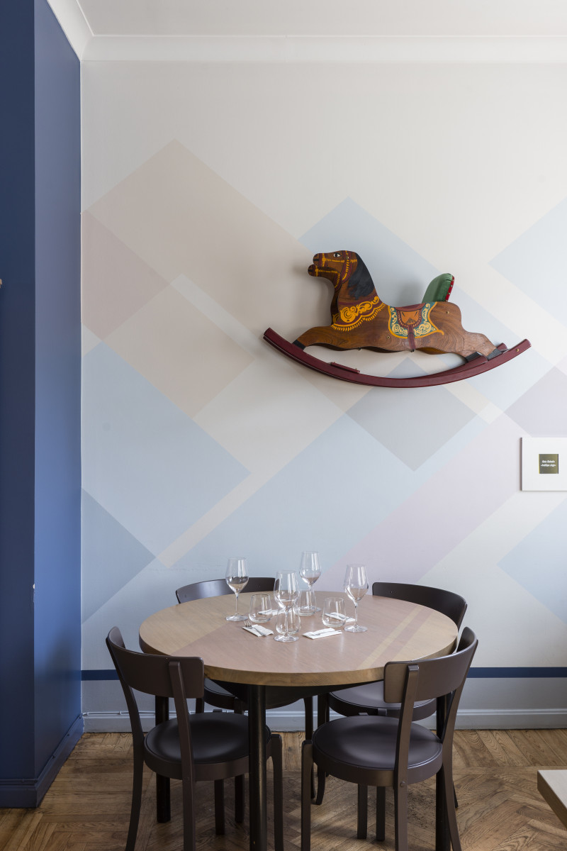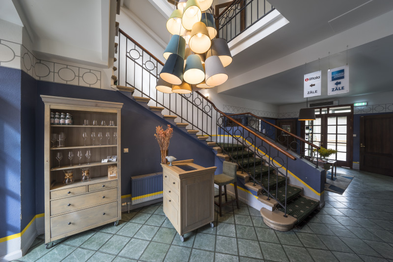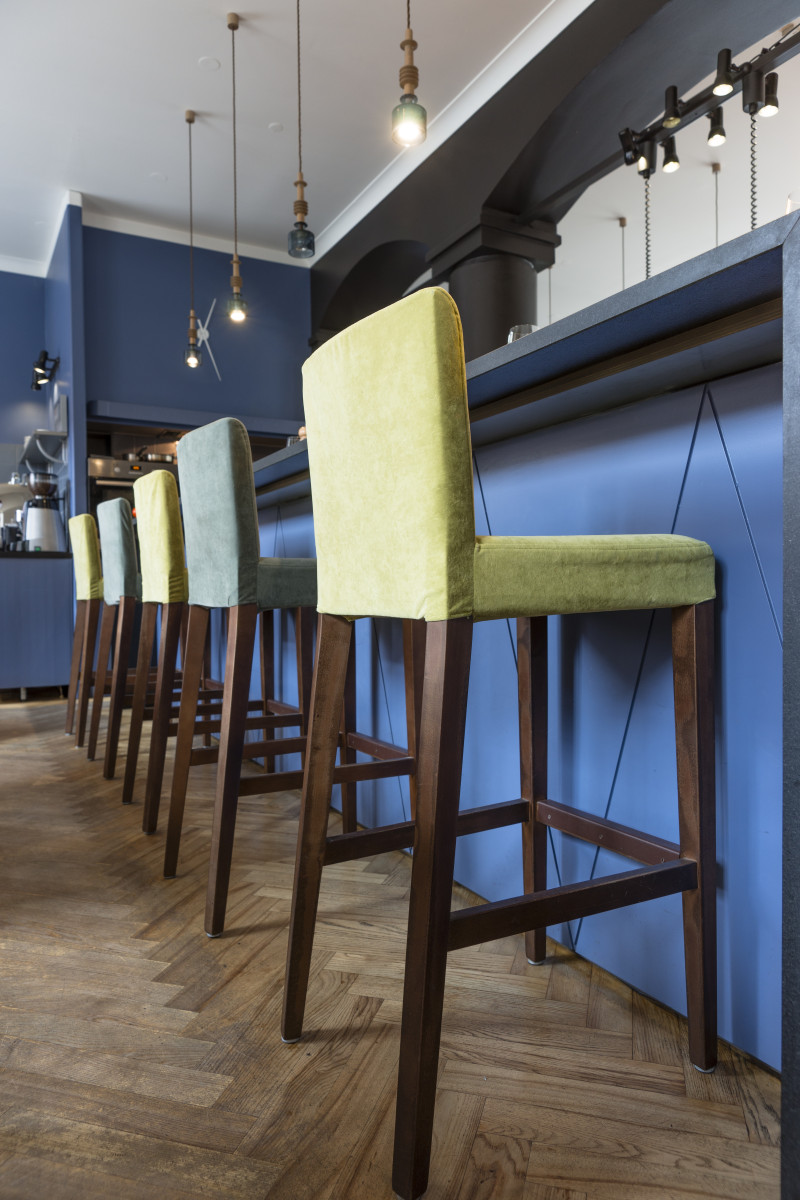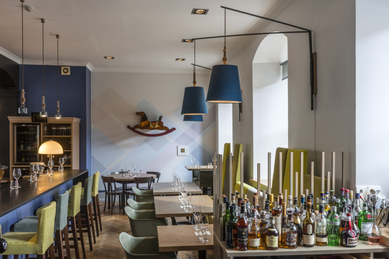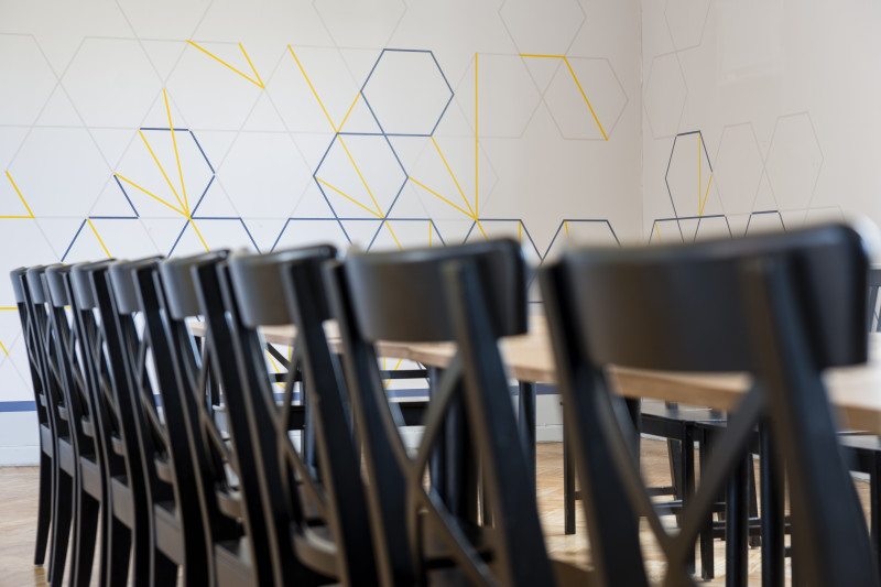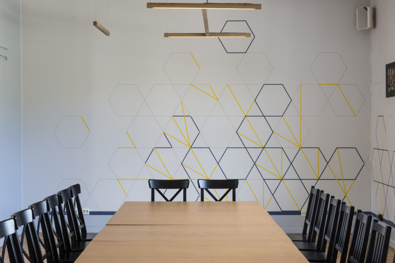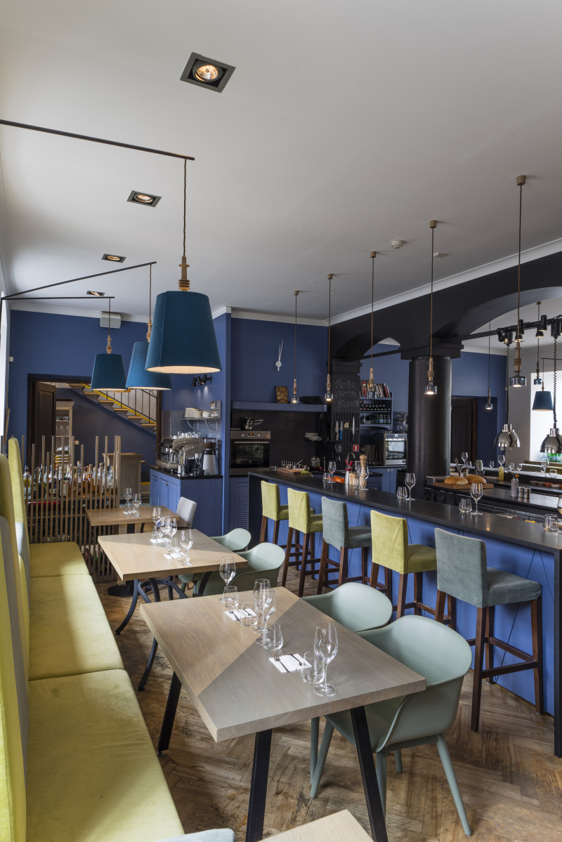 The Three Chefs restaurant has undergone a change on both floors, and the terrace has acquired a new form. The main task was to create a fresh and cosy interior while maintaining the special atmosphere that was there before. The main emphasis was placed on the walls and tables. On the 1st floor the main graphic design is a network of woven lines, but in the Iittala hall on the 2nd floor it is a fine, honeycomb pattern, which also highlights the refined dishes of this brand. The terrace structure is made of small metal bars, which gives it ease and transparency, while at the same time creating a sense of privacy for the restaurant’s guests. The configuration of the metal bars is inspired by the white, rectangular elements in the façade of Jacob’s Barracks.