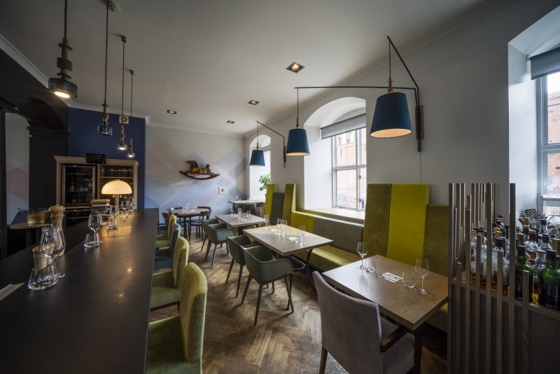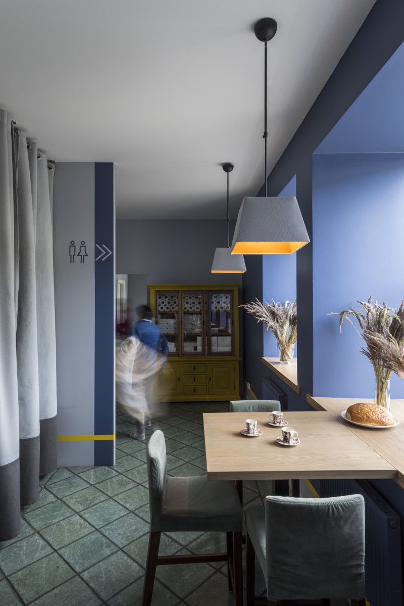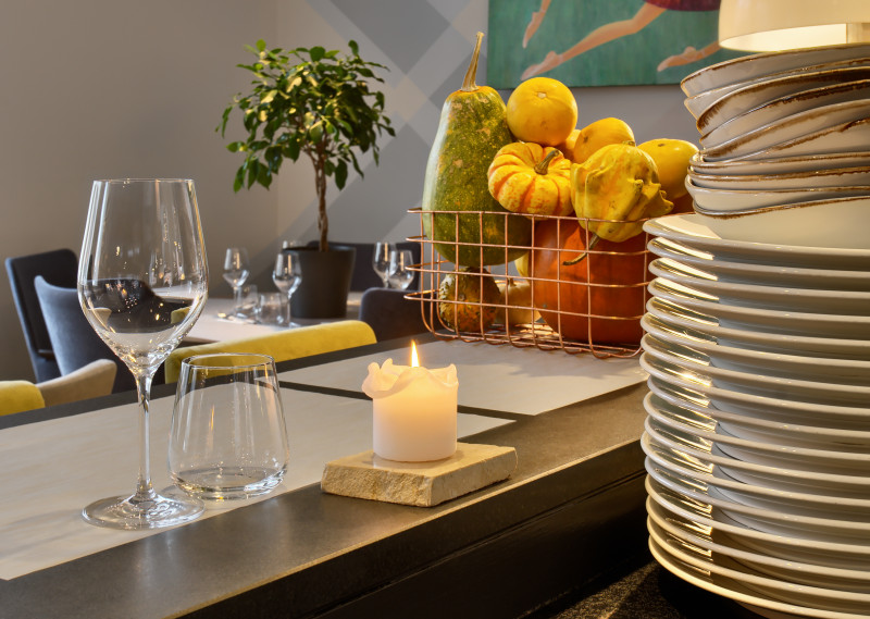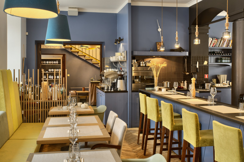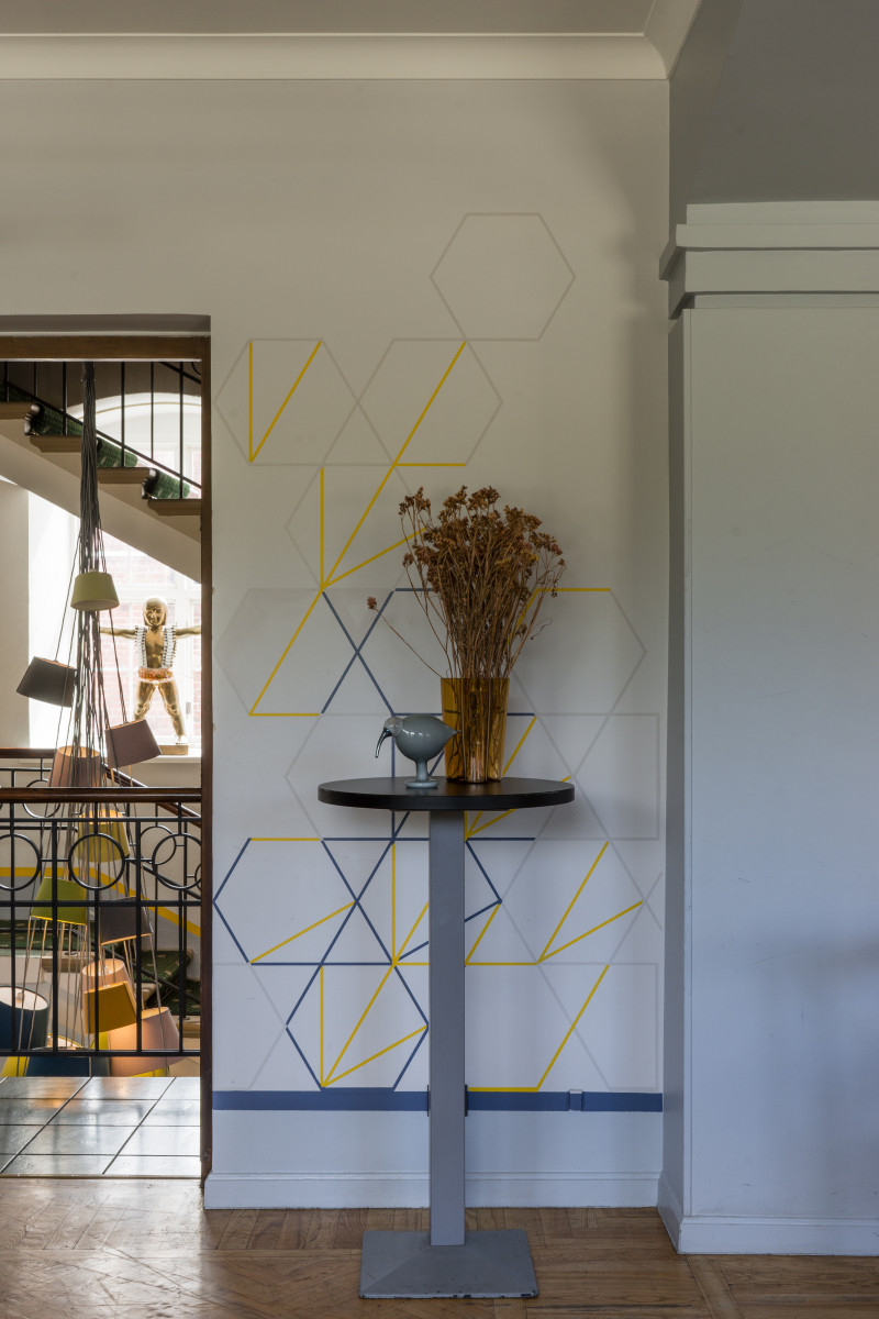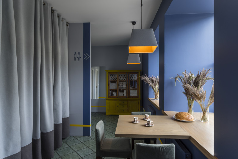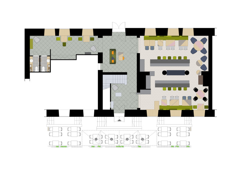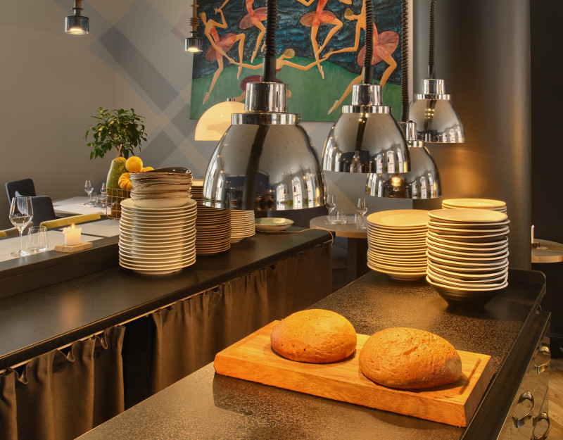 The Three Chefs restaurant has undergone a change on both floors, and the terrace has acquired a new form. The main task was to create a fresh and cosy interior while maintaining the special atmosphere that was there before. The main emphasis was placed on the walls and tables. On the 1st floor the main graphic design is a network of woven lines, but in the Iittala hall on the 2nd floor it is a fine, honeycomb pattern, which also highlights the refined dishes of this brand. The terrace structure is made of small metal bars, which gives it ease and transparency, while at the same time creating a sense of privacy for the restaurant’s guests. The configuration of the metal bars is inspired by the white, rectangular elements in the façade of Jacob’s Barracks.
